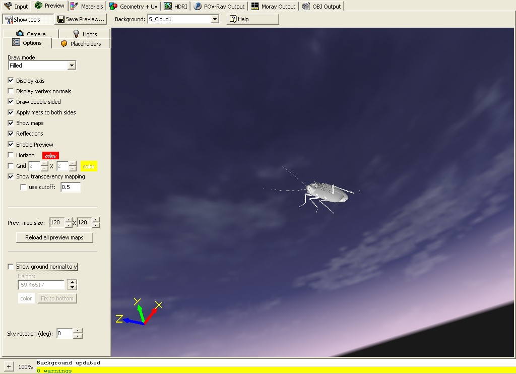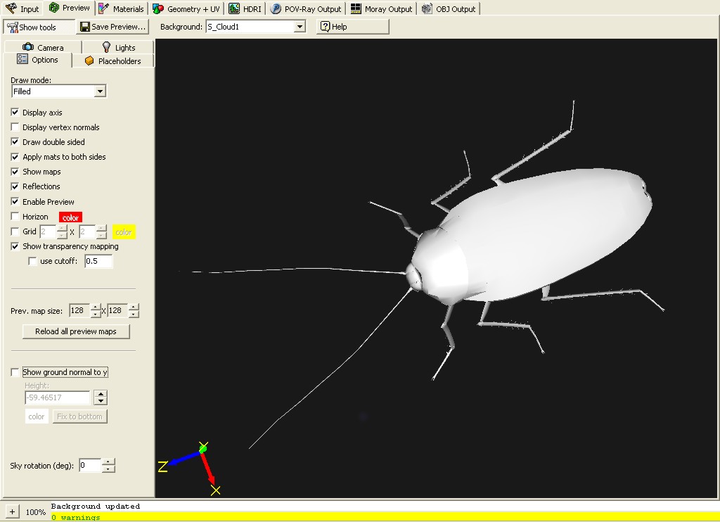 I will use a cockroach I downloaded from 3dCafe. You can choose another model if you will as long you know what you're doing. I will use PoseRay to visualize the model. PoseRay cannot open every 3D format, so if the format of your model is not supported by PoseRay, you will have to use some other program like 3dWin to convert it to a format PoseRay accepts. PoseRay is actually intended to work with Moray and Povray, but it works very well for the purpose of viewing 3D models.