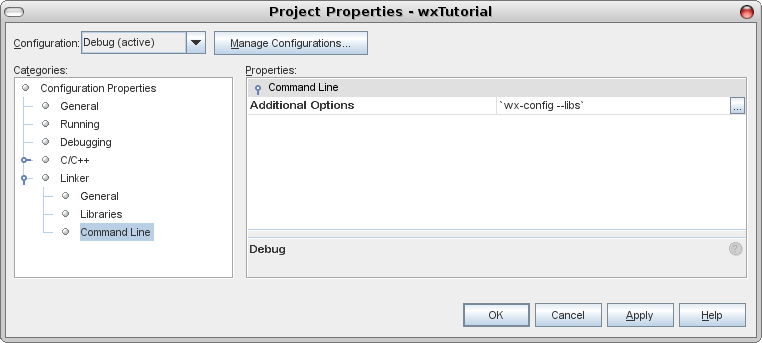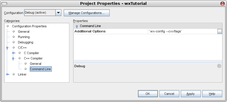 With the project already created, the compiler and linker options need to be set-up. wxWidgets needs libraries and include directories that would be a strain to configure manually, but fortunately it comes with a small utility program that outputs all those directories and other options. You should use it to configure compiler and linker options: